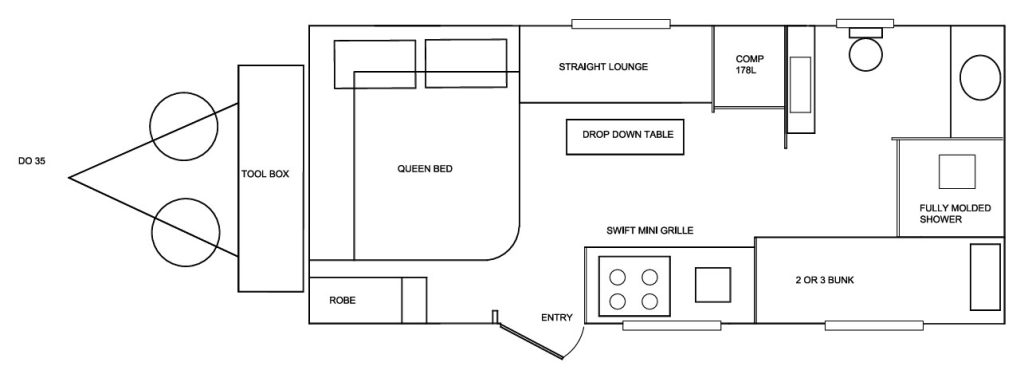 This is our smallest light weight caravan in our family range. With all major features, easy handling, easy to store and lots of storage inside the van.